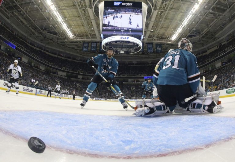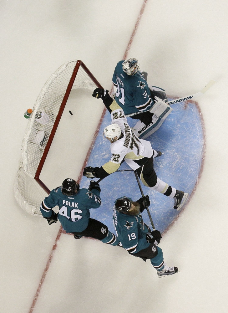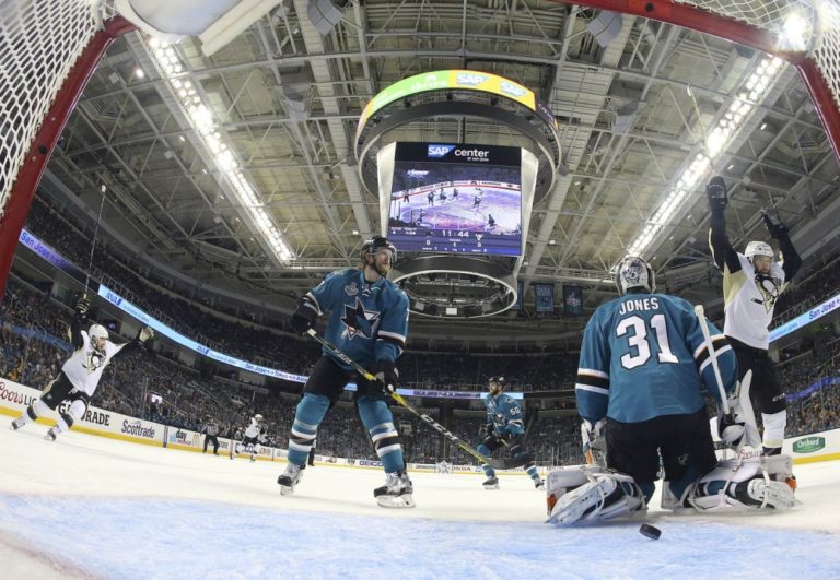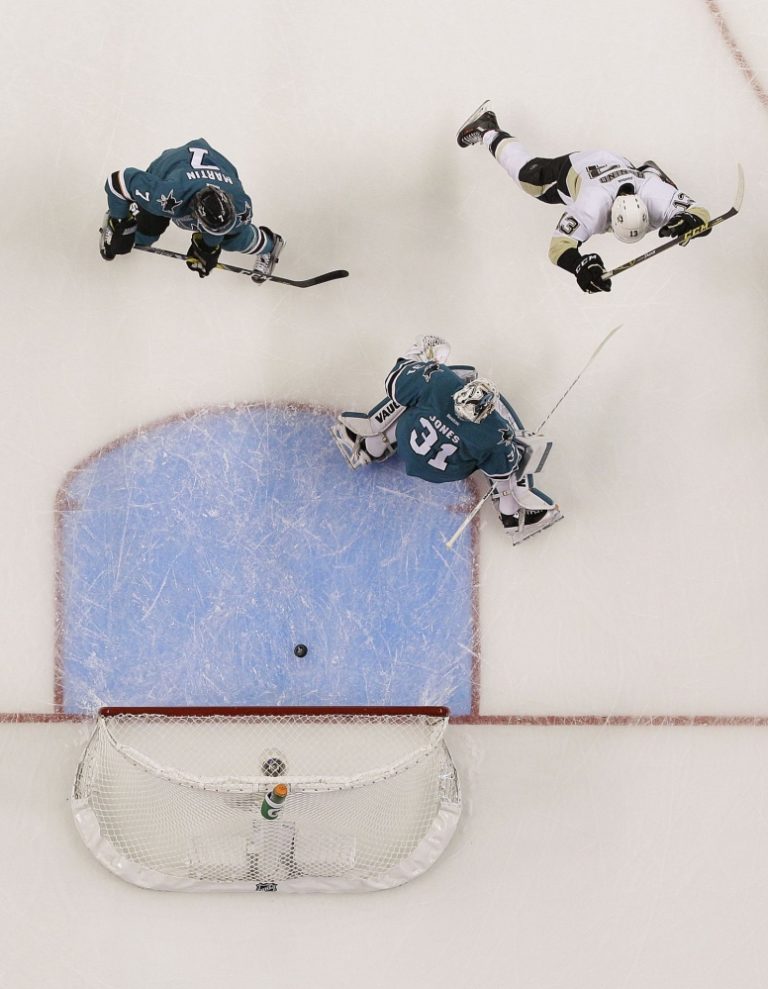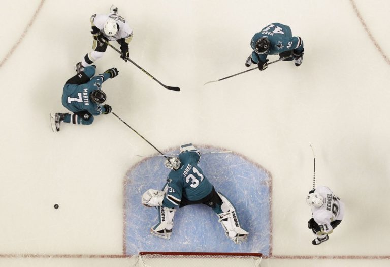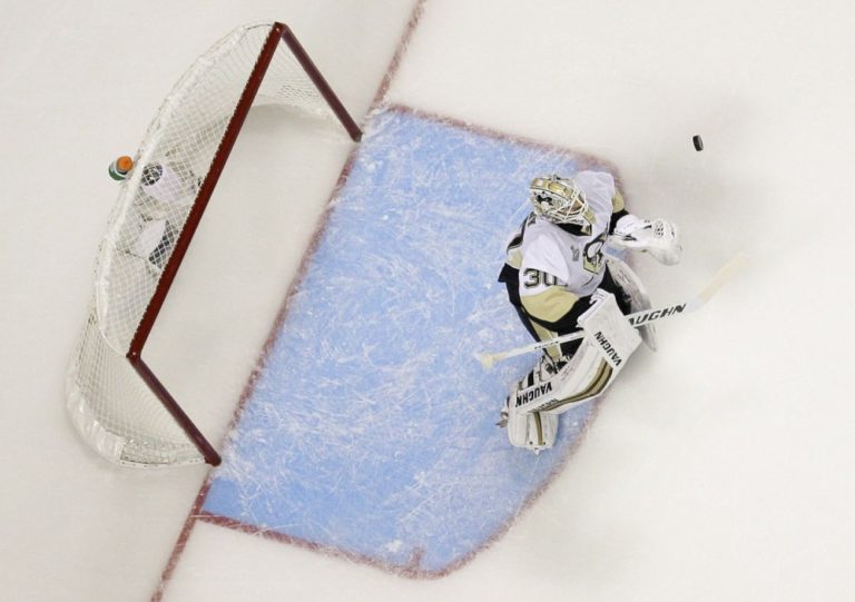 Puk z hokejky obrancu Pittsburghu Penguins Briana Dumoulina končí za chrbtom brankára San Jose Sharks Martina Jonesa počas šiesteho finálového zápasu NHL. San Jose, 12. jún 2016. Foto: Bruce Bennett/Getty Images via AP