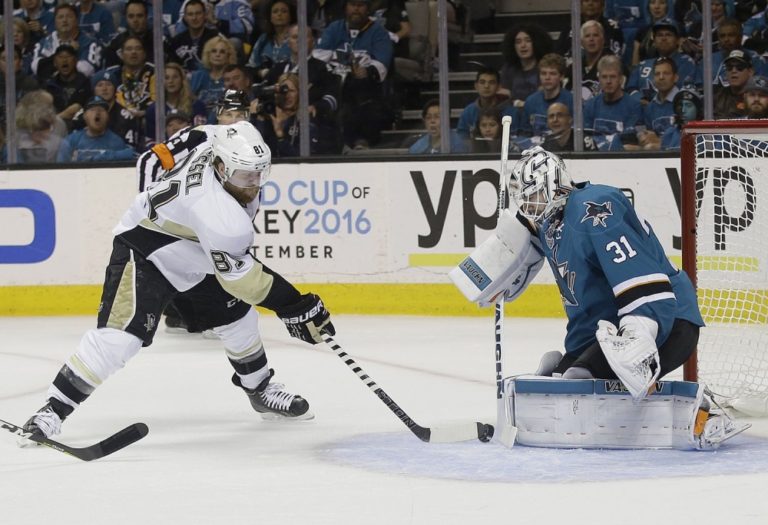Útočník Pittsburghu Penguins Phil Kessel (81) sa snaží prekonať brankára San Jose Sharks Martina Jonesa počas šiesteho finálového zápasu NHL. San Jose, 12. jún 2016. Foto: SITA/AP