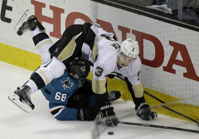 Obranca Pittsburghu Penguins Olli Määttä v súboji s útočníkom San Jose Sharks Melkerom Karlssonom počas šiesteho finálového zápasu NHL. San Jose, 12. jún 2016. Foto: SITA/AP