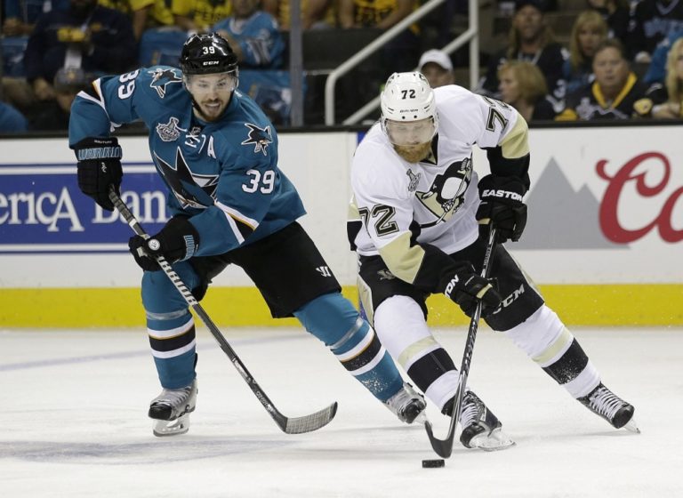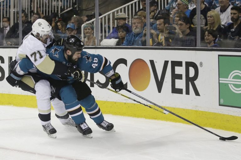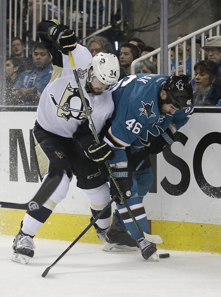 Útočník Pittsburghu Penguins Patric Hörnqvist v súboji s Loganom Coutureom počas šiesteho finálového zápasu NHL. San Jose, 12. jún 2016. Foto: SITA/AP