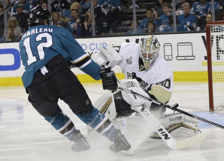 Zákrok brankára Pittsburghu Penguins Matta Murrayho (30) po zakončení útočníka San Jose Sharks Patricka Marleaua (12) počas šiesteho finálového zápasu NHL. San Jose, 12. jún 2016. Foto: SITA/AP