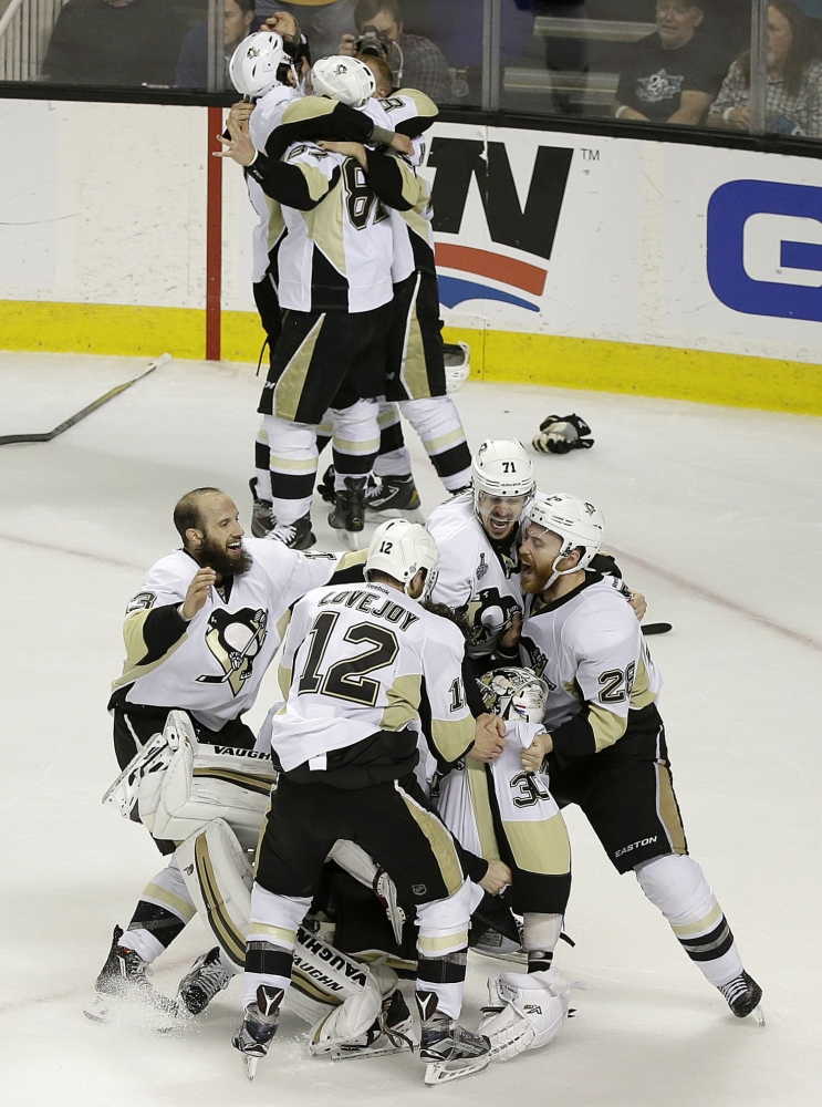 Hráči Pittsburghu Penguins sa tešia z triumfu v šestom finálovom zápase NHL, v ktorom zvíťazili na ľade San Jose Sharks 3:1 a získali Stanleyho pohár. San Jose, 12. jún 2016. Foto: SITA/AP