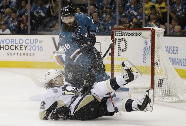 Útočník Pittsburghu Penguins Carl Hagelin padá po súboji s obrancom San Jose Sharks Brentom Burnsom počas šiesteho finálového zápasu NHL. San Jose, 12. jún 2016. Foto: SITA/AP