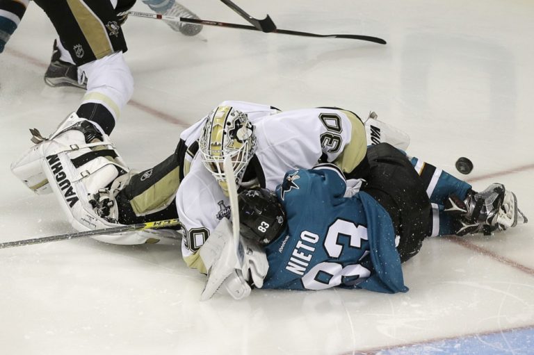 Brankár Pittsburghu Penguins Matt Murray (30) v súboji s útočníkom San Jose Sharks Mattom Nietom (83) počas šiesteho finálového zápasu NHL. San Jose, 12. jún 2016. Foto: SITA/AP