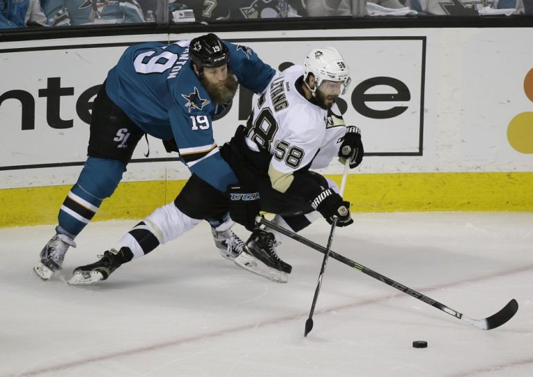 Útočník San Jose Sharks Joe Thornton (19) v súboji s obrancom Pittsburghu Penguins Krisom Letangom počas šiesteho finálového zápasu NHL. San Jose, 12. jún 2016. Foto: SITA/AP