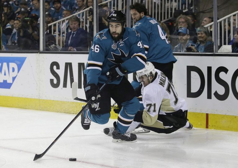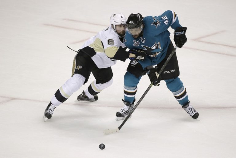 Útočník San Jose Sharks Joel Ward (42) v súboji s obrancom Pittsburghu Penguins Brianom Dumoulinom (8) počas šiesteho finálového zápasu NHL. San Jose, 12. jún 2016. Foto: SITA/AP