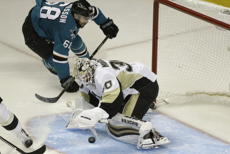 Zákrok brankára Pittsburghu Penguins Matta Murrayho (30) počas šiesteho finálového zápasu NHL. San Jose, 12. jún 2016. Foto: SITA/AP