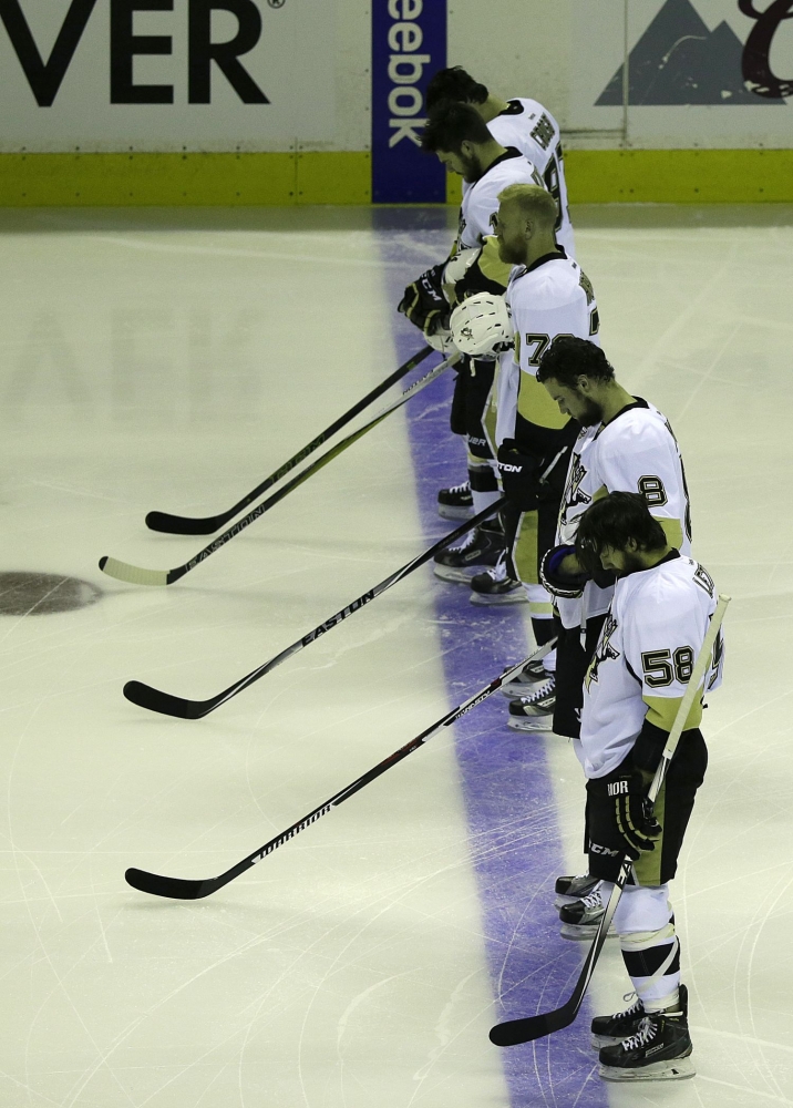 Hráči Pittsburghu Penguins pred šiestym finálovým zápasom NHL, v ktorom vyhrali na ľade San Jose Sharks 3:1 a získal Stanleyho pohár. San Jose, 12. jún 2016. Foto: SITA/AP