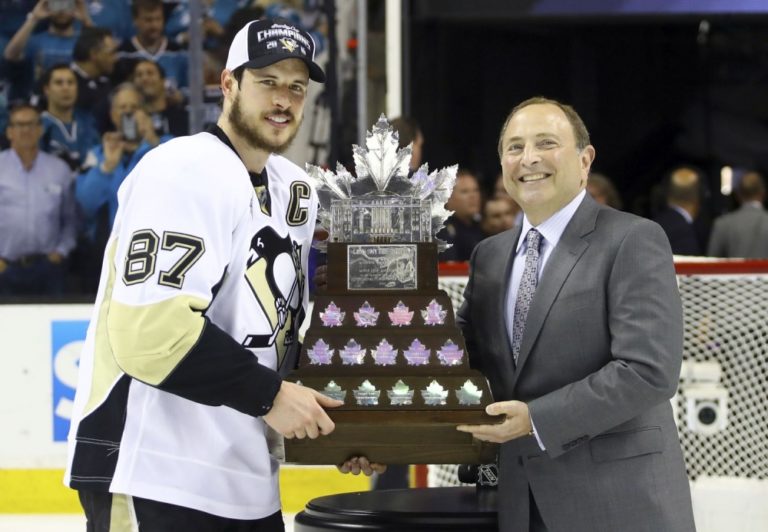Kapitán Pittsburghu Penguins Sidney Crosby si preberá Conn Smythe Trophy pre najužitočnejšieho hráča play-off NHL po šiestom finálovom zápase, v ktorom jeho tím vyhral na ľade San Jose Sharks a získal Stanleyho pohár. San Jose, 12. jún 2016. Foto: Bruce Bennett/Getty Images via AP