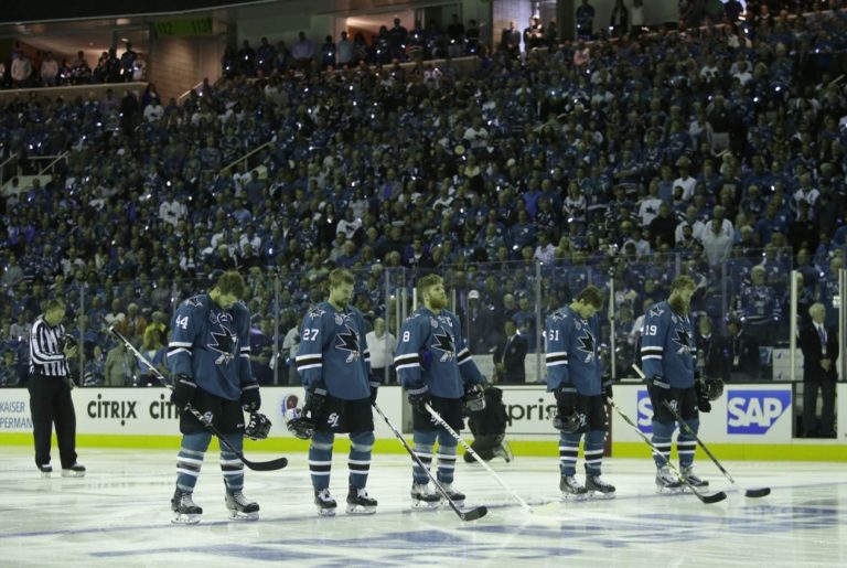 Hráči San Jose Sharks pred šiestym finálovým zápasom NHL, v ktorom podľahli 'tučniakom' 1:3. San Jose, 12. jún 2016. Foto: SITA/AP