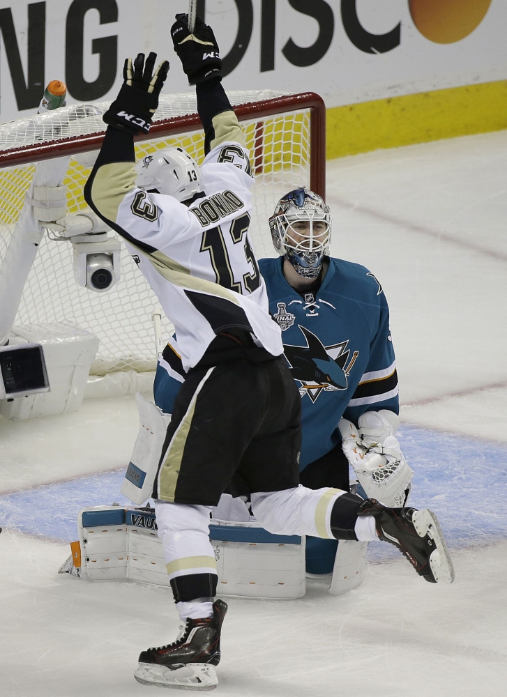 Útočník Pittsburghu Penguins Nick Bonino sa teší z gólu svojho tímu v sieti 'žralokov' počas šiesteho finálového zápasu NHL. San Jose, 12. jún 2016. Foto: SITA/AP