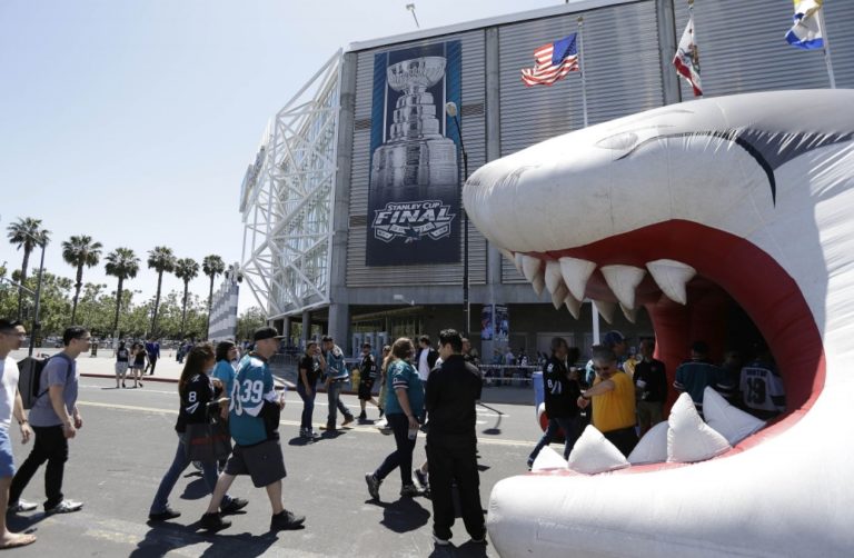 Fanúšikovia San Jose Sharks pred šiestym finálovým zápasom NHL, v ktorom 'žraloci' podľahli Pittsburghu 1:3. San Jose, 12. jún 2016. Foto: SITA/AP