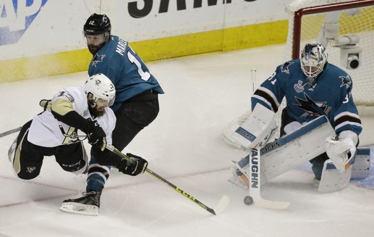 Útočník San Jose Sharks Patrick Marleau (12) v súboji s Nickom Boninom z Pittsburghu Penguins pred brankárom Martinom Jonesom počas šiesteho finálového zápasu NHL. San Jose, 12. jún 2016. Foto: SITA/AP
