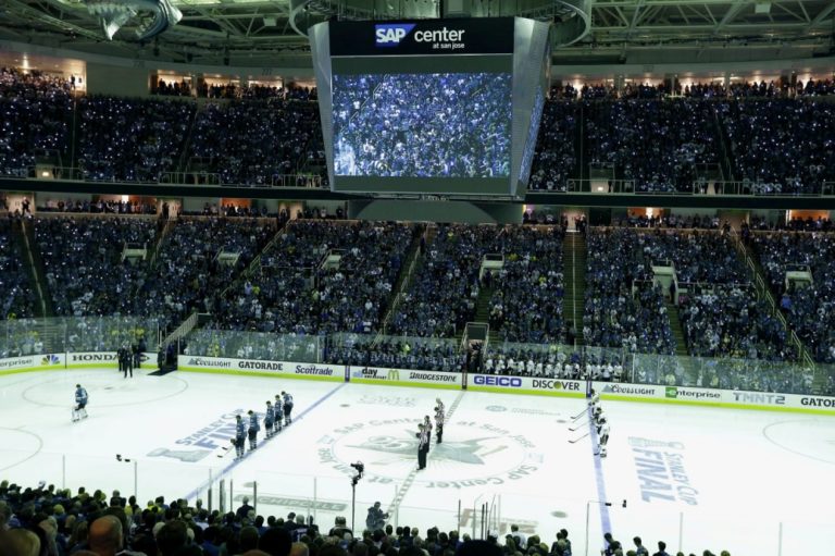 Slávnostný úvod šiesteho finálového zápasu NHL, v ktorom Pittsburgh vyhral na ľade 'žralokov' a získal Stanleyho pohár. San Jose, 12. jún 2016. Foto: SITA/AP