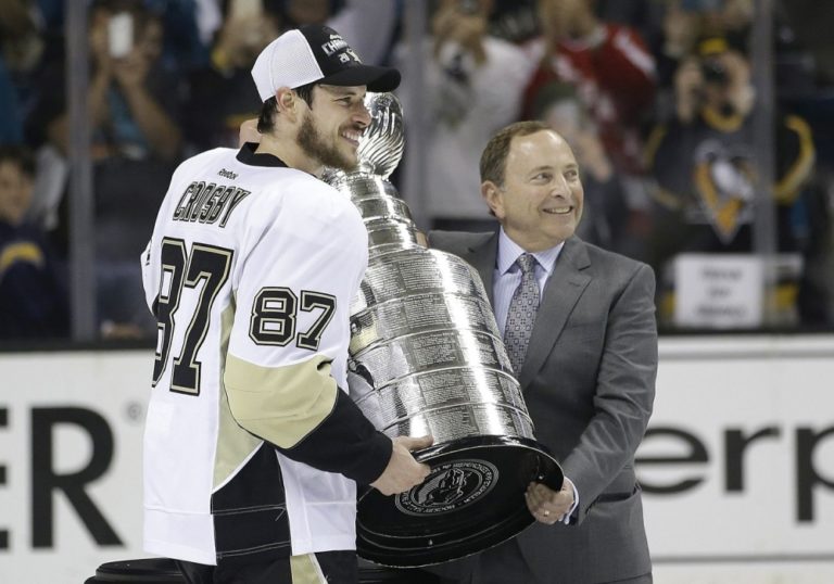 Kapitán Pittsburghu Penguins Sidney Crosby preberá Stanleyho pohár od šéfa NHL Garyho Betmana po šiestom finálovom zápase NHL, v ktorom 'tučniaci' vyhrali na ľade San Jose Sharks 3:1. San Jose, 12. jún 2016. Foto: SITA/AP
