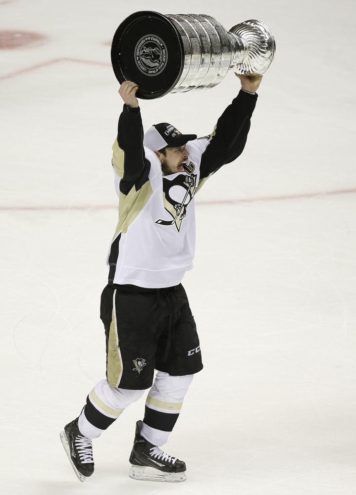 Kapitán Pittsburghu Penguins Sidney Crosby drží nad hlavou Stanleyho pohár po šiestom finálovom zápase NHL, v ktorom jeho tím vyhral na ľade San Jose Sharks 3:1. San Jose, 12. jún 2016. Foto: SITA/AP