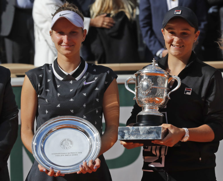 Víťaza Roland Garros Ashleigh Bartyová (vpravo) a zdolaná finalistka Markéta Vondroušová. Paríž, 8. jún 2019.