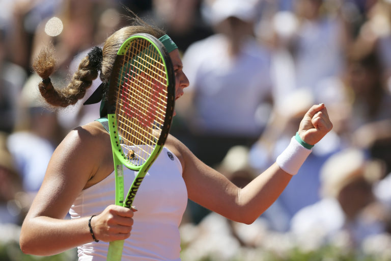 Lotyšská tenistka Jelena Ostapenková sa teší z triumfu nad Rumunkou Simonou Halepovou vo finále Roland Garros. Paríž, 10. jún 2017. Foto: SITA/AP.