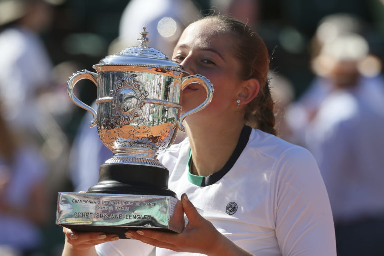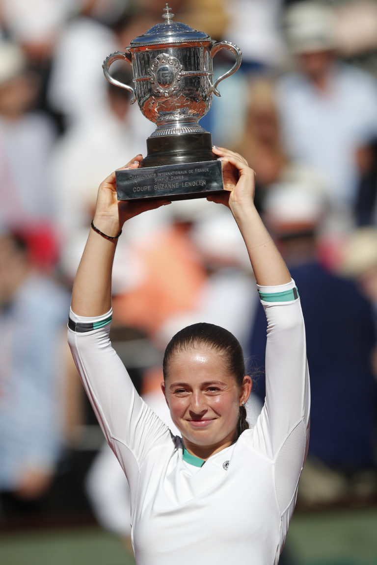 Lotyšská tenistka Jelena Ostapenková s víťaznou trofejou po finálovom zápase Roland Garros, v ktorom zdolala Rumunku Simonu Halepovú 4:6, 6:4, 6:3. Paríž, 10. jún 2017. Foto: SITA/AP.
