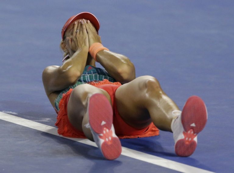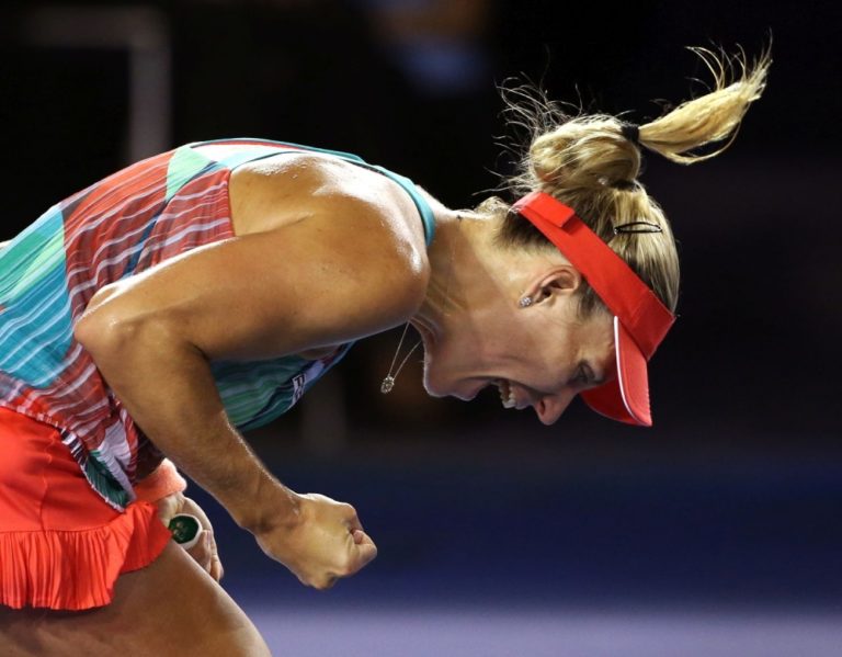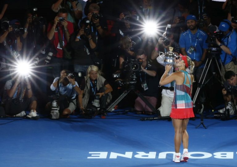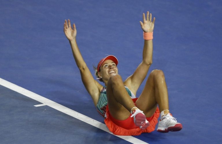 Nemecká tenistka Angelique Kerberová sa teší z triumfu nad Serenou Williamsovou po finálovom zápase na Australian Open. Melbourne, 30. január 2016. Foto: SITA/AP