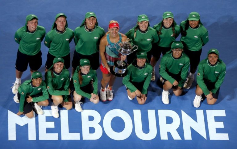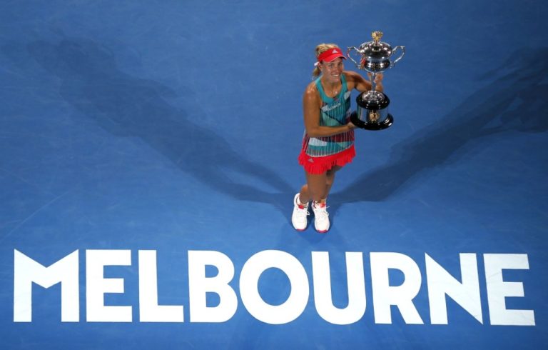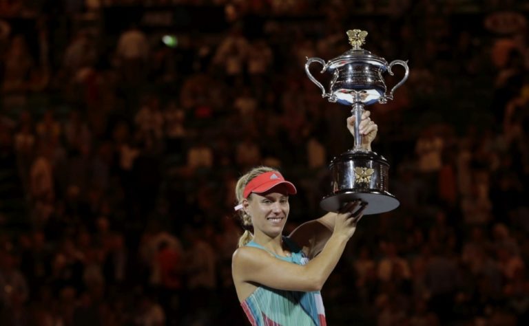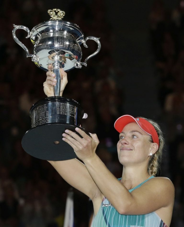 Nemecká tenistka Angelique Kerberová s víťaznou trofejou po finálovom zápase na Australian Open, v ktorom zdolala líderku svetového rebríčka Serenu Williamsovú. Melbourne, 30. január 2016. Foto: SITA/AP