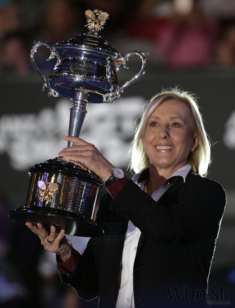 Tenisová legenda Martina Navrátilová s trofejou pre víťazku Australian Open pred finálovým zápasom medzi Serenou Williamsovou a Mariou Šarapovovou. Melbourne, 31. január 2015. Foto: SITA/AP