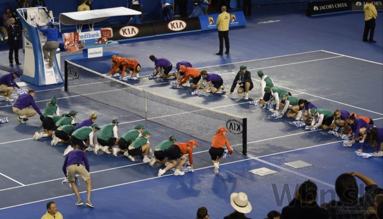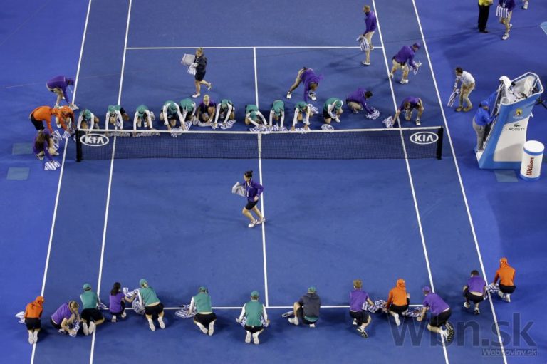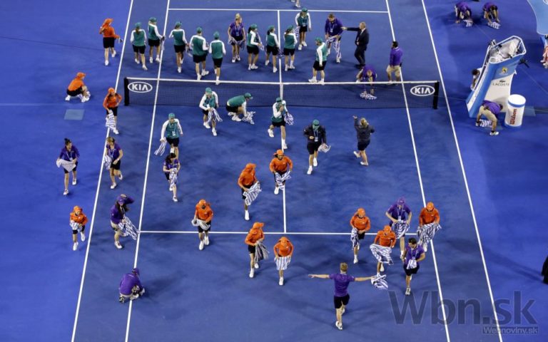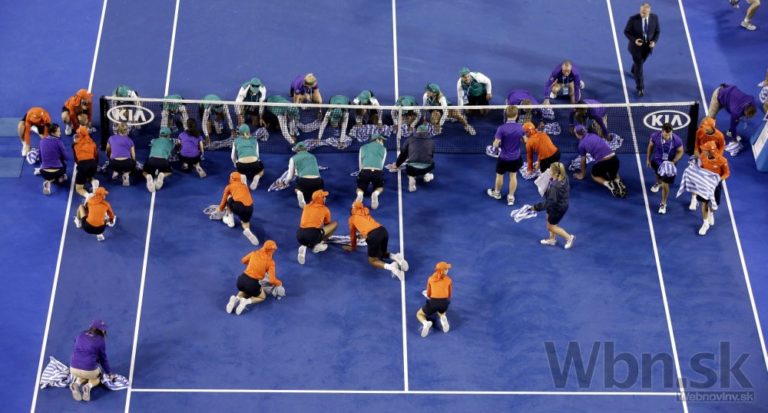 Zberači loptičiek sušia kurt po dažďovej prehánke počas finálového zápasu Australian Open, v ktorom americká tenistka Serena Williamsová porazila Rusku Mariu Šarapovovú. Melbourne, 31. január 2015. Foto: SITA/AP