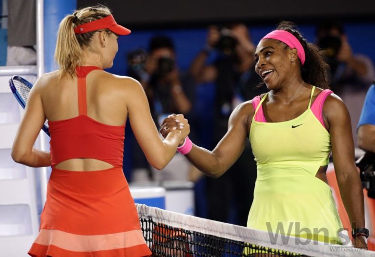 Zľava: Ruská tenistka Maria Šarapovovú gratuluje Serene Williamsovej k víťazstvu po finálovom zápase Australian Open, v ktorom ju Američanka porazila za 111 minút 6:3, 7:6 (5). Melbourne, 31. január 2015. Foto: SITA/AP