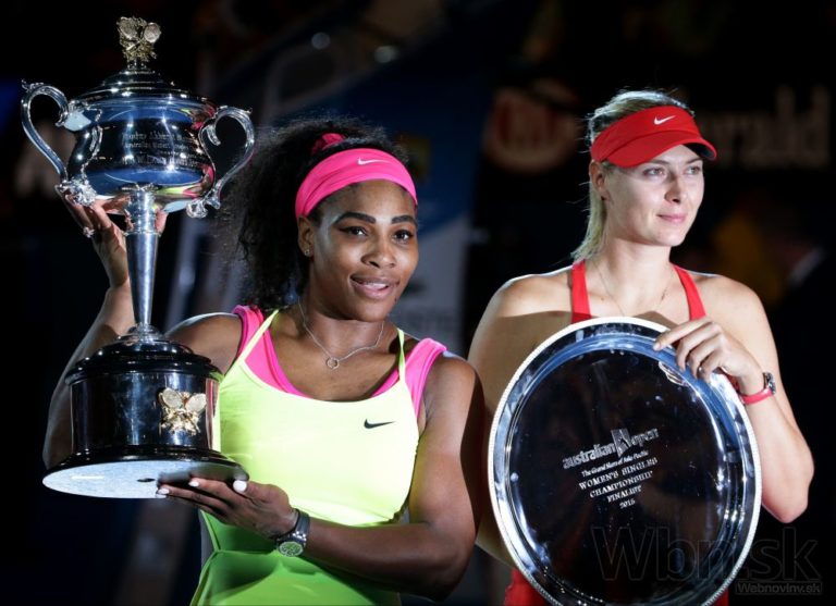 Víťazka Australian Open Serena Williamsová a zdolaná finalistka Maria Šarapovová pózuju fotografom po finálovom zápase Australian Open, v ktorom líderka svetového rebríčka zdolala svetovú dvojku za 111 minút 6:3, 7:6 (5). Melbourne, 31. január 2015. Foto: SITA/AP