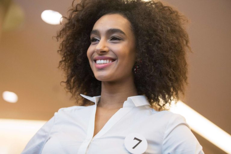 Finalistka súťaže Jasmína Tatyová z Trnavy s číslom 7 počas oficiálneho predstavenia finalistiek 23. ročníka súťaže krásy Miss Slovensko 2018. Bratislava, 1. február 2018 Foto: SITA/Branislav Bibel