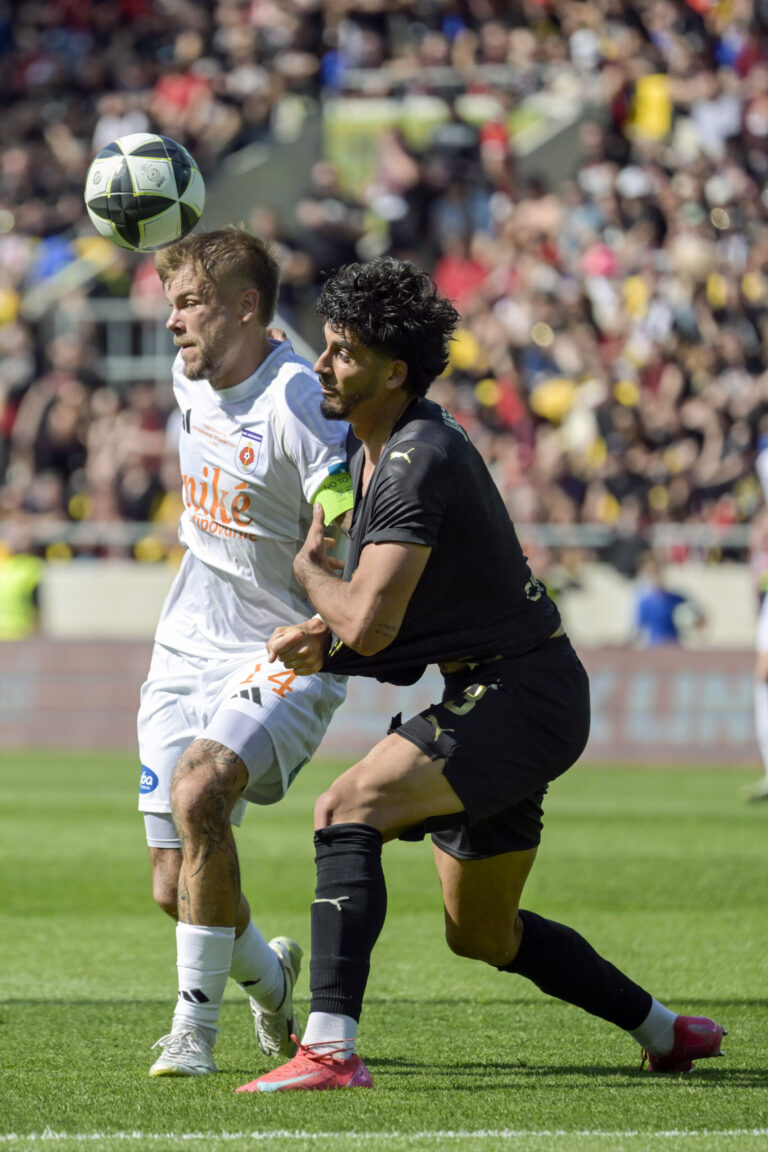 Sprava uprostred: Robo Jureškin z FC Spartak Trnava a Jan Hladík z MFK Ružomberok počas finálového zápasu Slovnaft Cupu medzi MFK Ružomberok a FC Spartak Trnava v DAC Aréne v Dunajskej Strede. Dunajská Streda, 1. máj 2025. Foto: SITA/Milan Illík
