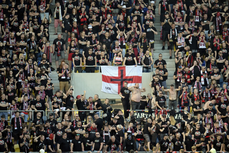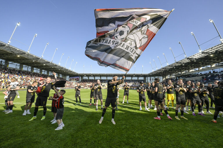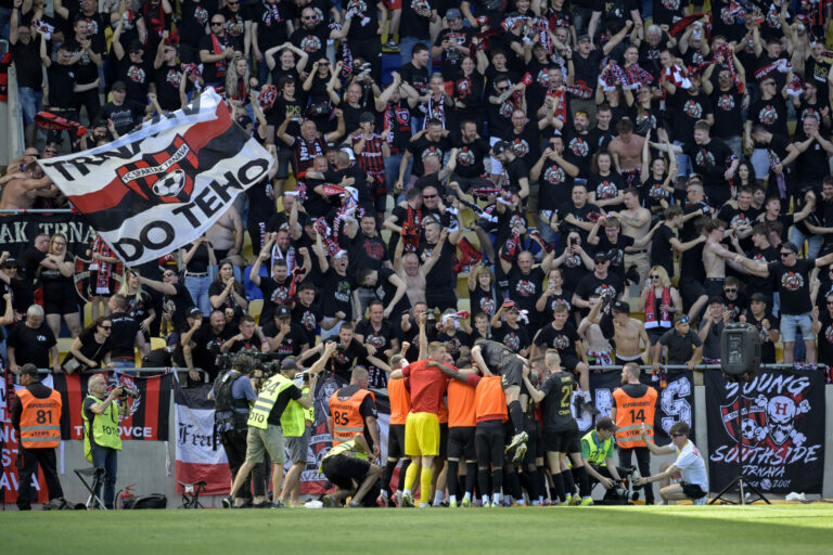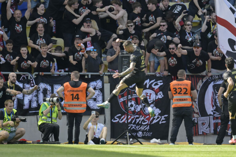 Fanúšikovia FC Spartak Trnava po finálovom futbalovom zápase Slovnaft Cupu 2024/2025 medzi MFK Ružomberok a FC Spartak Trnava v DAC Aréne v Dunajskej Strede. Dunajská Streda, 1. máj 2025. Foto: SITA/Milan Illík
