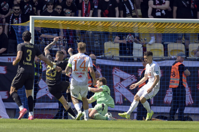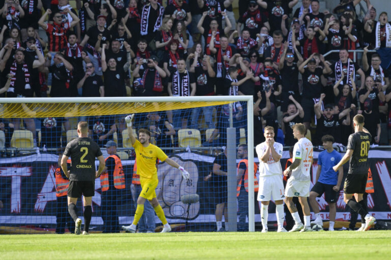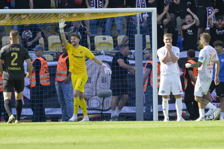 Zľava uprostred: Brankár Žiga Frelih z FC Spartak Trnava a Dominik Ťapaj z MFK Ružomberok po nepremenenom pokutovom kope počas finálového zápasu Slovnaft Cupu medzi MFK Ružomberok a FC Spartak Trnava v DAC Aréne v Dunajskej Strede. Dunajská Streda, 1. máj 2025. Foto: SITA/Milan Illík