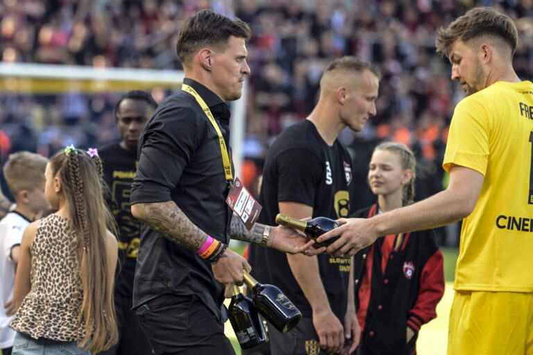 Športový riaditeľ FC Spartak Trnava a bývalý futbalový reprezent Martin Škrteľ (vľavo v popredí) po finálovom zápase Slovnaft Cupu 2024/2025 s trofej medzi MFK Ružomberok a FC Spartak Trnava v DAC Aréne v Dunajskej Strede. Dunajská Streda, 1. máj 2025. Foto: SITA/Milan Illík