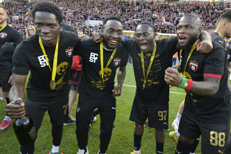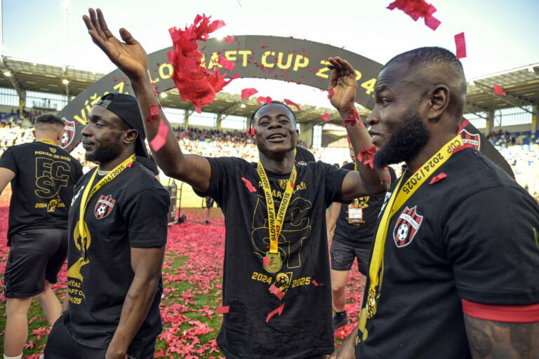Radosť hráčov FC Spartak Trnava z víťazstva po finálovom zápase Slovnaft Cupu 2024/2025 medzi MFK Ružomberok a FC Spartak Trnava v DAC Aréne v Dunajskej Strede. Dunajská Streda, 1. máj 2025. Foto: SITA/Milan Illík