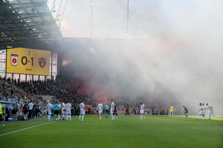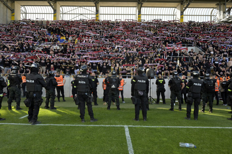 Prerušený zápas počas finálového futbalového zápasu Slovnaft Cupu 2024/2025 s trofej medzi MFK Ružomberok a FC Spartak Trnava v DAC Aréne v Dunajskej Strede. Dunajská Streda, 1. máj 2025. Foto: SITA/Milan Illík