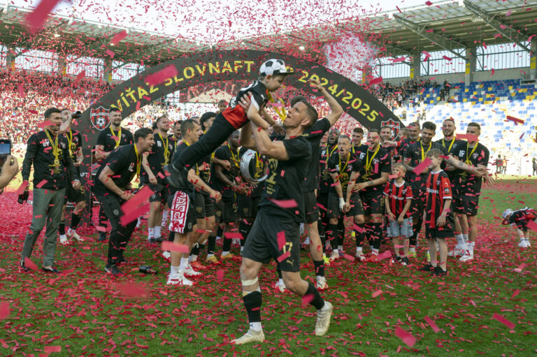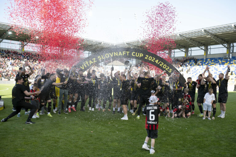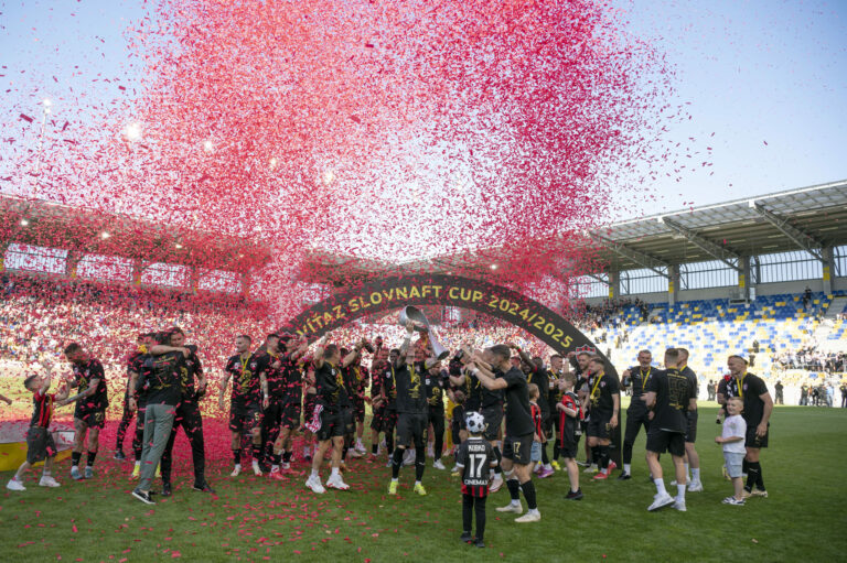 Radosť hráčov FC Spartak Trnava po finálovom futbalovom zápase Slovnaft Cupu 2024/2025 medzi MFK Ružomberok a FC Spartak Trnava v DAC Aréne v Dunajskej Strede. Dunajská Streda, 1. máj 2025. Foto: SITA/Milan Illík