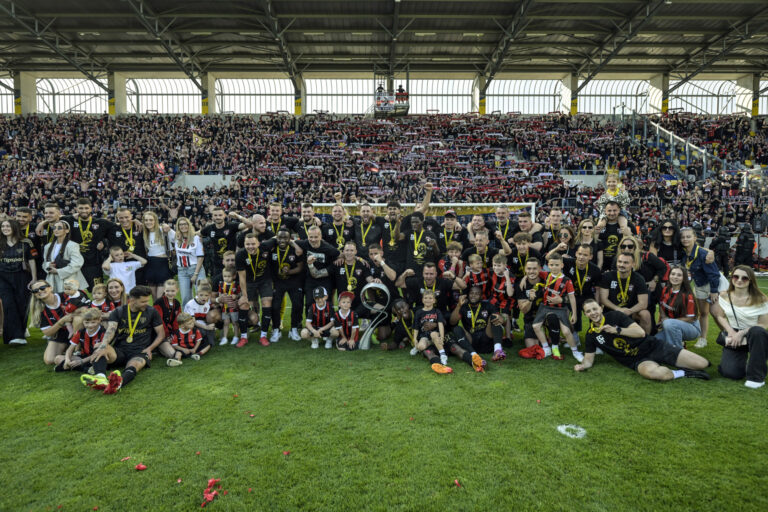 Spoločná fotografia hráčov a fanúšikov FC Spartak Trnava s trofejou pre víťaza po finálovom futbalovom zápase Slovnaft Cupu 2024/2025 medzi MFK Ružomberok a FC Spartak Trnava v DAC Aréne v Dunajskej Strede. Dunajská Streda, 1. máj 2025. Foto: SITA/Milan Illík