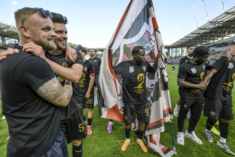 Radosť hráčov FC Spartak Trnava z víťazstva po finálovom futbalovom zápase Slovnaft Cupu 2024/2025 medzi MFK Ružomberok a FC Spartak Trnava v DAC Aréne v Dunajskej Strede. Dunajská Streda, 1. máj 2025. Foto: SITA/Milan Illík