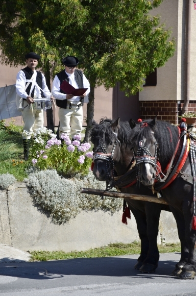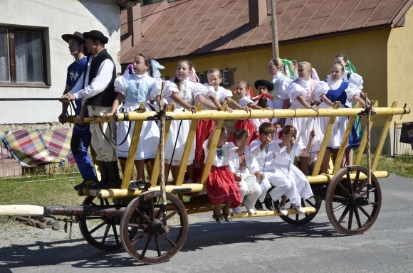 Sprievod furmanských záprahov a folklórnej skupiny počas dní obce Vikartovce. Vikartovce, 17. august 2013. Foto: SITA/Radoslav Maťaš