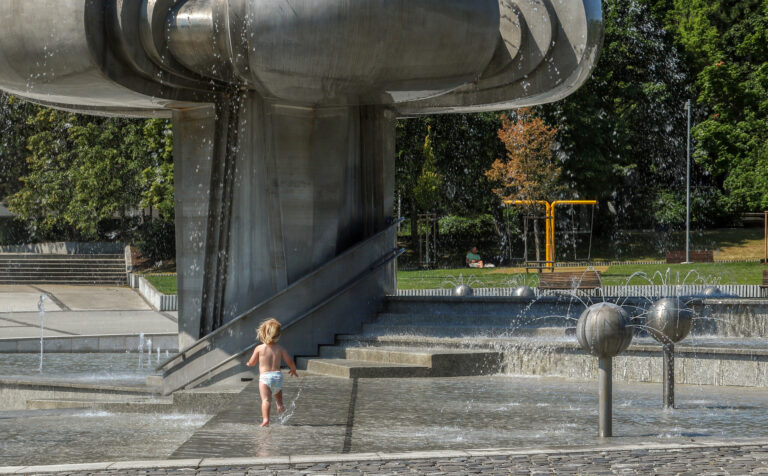 Na bratislavskom Námestí slobody beží dieťa cez fontánu Družba a špliecha okolo seba vodu. Bratislava, 19. jún 2025. Foto: SITA/Andrea Mezeiová