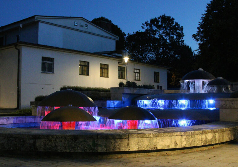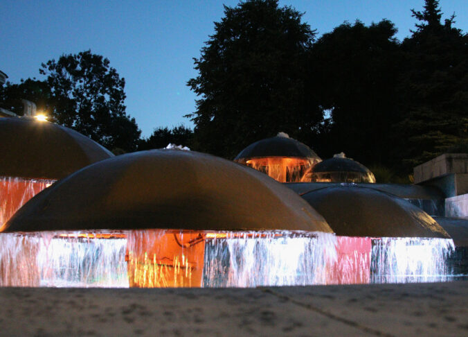Svietiaca kaskádovitá fontána znázorňujúca rodinu – rodičov a tri deti – s názvom Rodina hríby na Karloveskej ulici v bratislavskej Karlovej Vsi. Bratislava, 22. júl 2025. Foto: SITA/Andrea Mezeiová