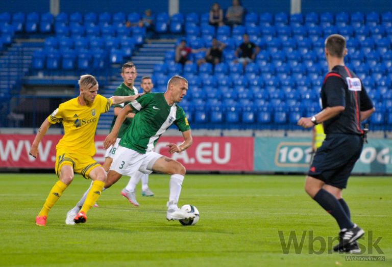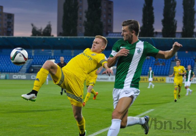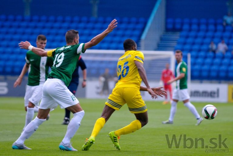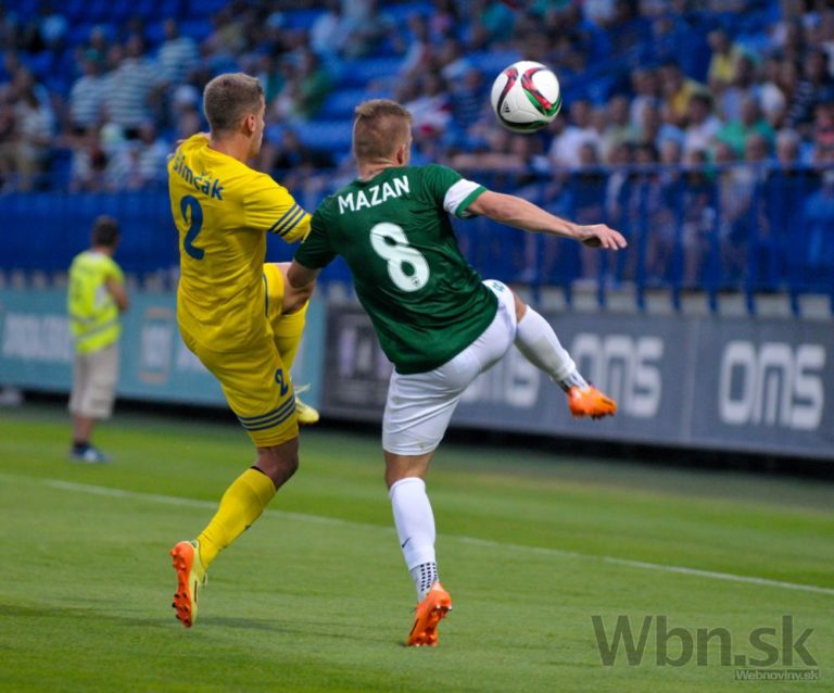 Zľava: Karol Mészáros zo Slovana a Ľuboš Kolár z Myjavy v zápase 2. kola jesennej časti Fortuna ligy medzi ŠK Slovan Bratislava - Spartak Myjava . Bratislava, 26. júl 2015. Foto: SITA/Ján Slovák