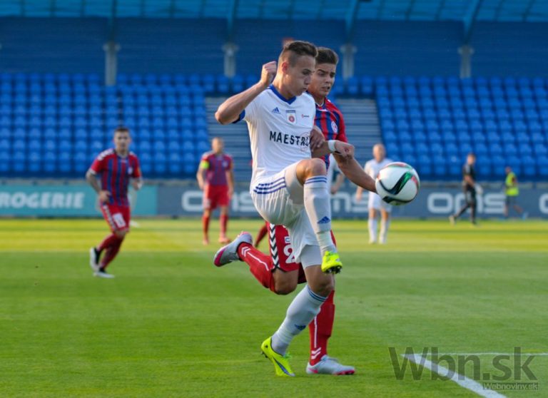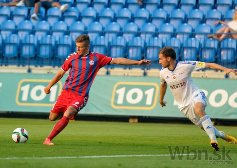 Zľava: Filip Oršula zo Slovana a Štefan Pekár z Myjavy v zápase 2. kola jesennej časti Fortuna ligy medzi ŠK Slovan Bratislava - Spartak Myjava . Bratislava, 26. júl 2015. Foto: SITA/Ján Slovák