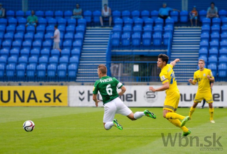 Zľava: Jan Kalabiška z FK Senica a Martin Boszorád z MFK Ružomberok v zápase 2. kola futbalovej Fortuna ligy. Senica, 24. júl 2015. Foto: SITA/Martin Medňanský