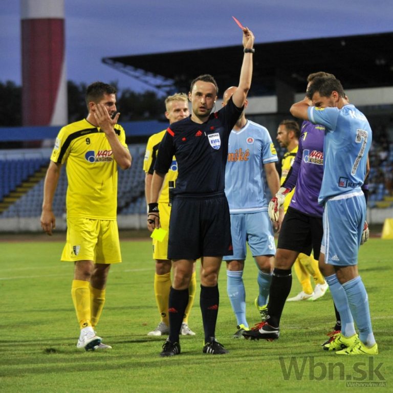 Hlavný rozhodca Vladimír Vlk (uprostred) s červenou kartou a previnilec František Kubík (vpravo) zo Slovana v zápase 2. kola jesennej časti Fortuna ligy medzi ŠK Slovan Bratislava - Spartak Myjava . Bratislava, 26. júl 2015. Foto: SITA/Ján Slovák