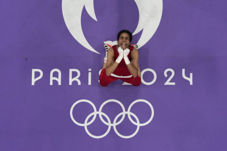 Maročanka Widad Bertalová sa raduje po víťazstve nad Thajčankou Jutamas Jitpongovou v zápase v boxe žien do 54 kg na Letných olympijských hrách 2024 v utorok 30. júla 2024 v Paríži. Foto: SITA/AP