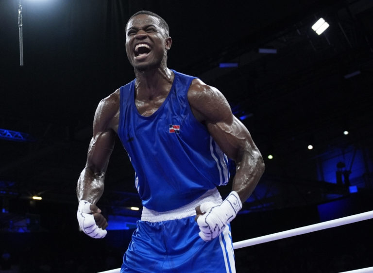 Dominikánsky reprezentant Cristian Pinales sa raduje po víťazstve nad Číňanom Tuohetaerbieke Tanglatihanom v zápase v boxe mužov do 80 kg na Letných olympijských hrách 2024 v utorok 30. júla 2024 v Paríži. Foto: SITA/AP
