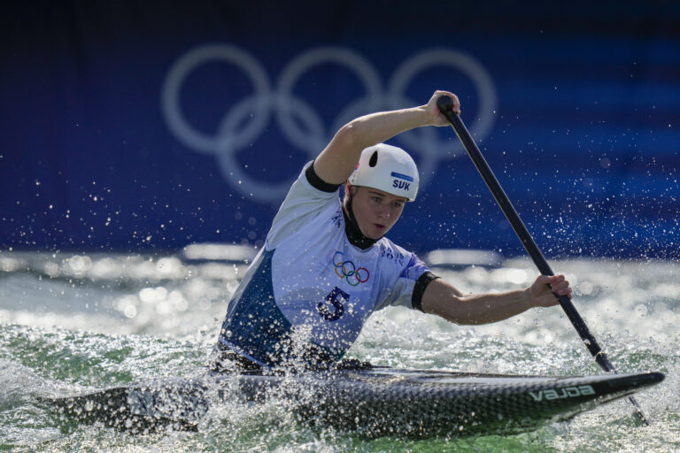 Slovenský reprezentant vo vodnom slalome Jakub Grigar počas kvalifikácie K1 na letnej olympiáde v Paríži. Vaires-sur-Marne, 30. júl 2024. Foto: SITA/AP.