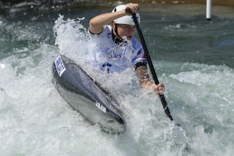 Slovenská reprezentantka vo vodnom slalome Zuzana Paňková počas kvalifikácie C1 na letnej olympiáde v Paríži. Vaires-sur-Marne, 30. júl 2024. Foto: SITA/AP.